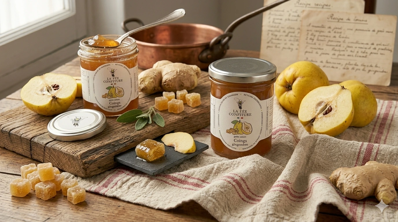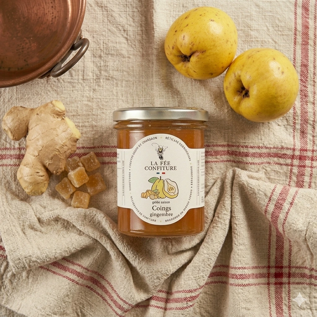 L’alliance audacieuse du terroir et de l’exotisme. Laissez-vous séduire par la douceur dorée du coing, relevée par la puissance aromatique du gingembre frais. Une gelée translucide et fondante, travaillée à la main pour capturer l’essence d’une recette magique et 100% naturelle.